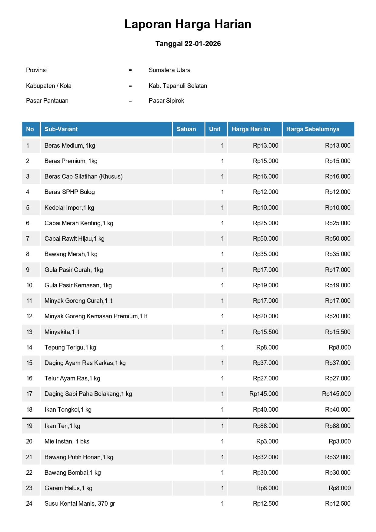 Laporan Harga Harian Bahan Pokok Kab. Tapanuli Selatan Pasar Sipirok 22 Januari 2026
